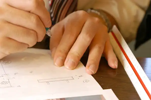 お客様からお伺いした情報を元に、システム構成、部品構造、デザイン、それぞれの部品の製法などを検討し徐々に構想を具体化していきます。